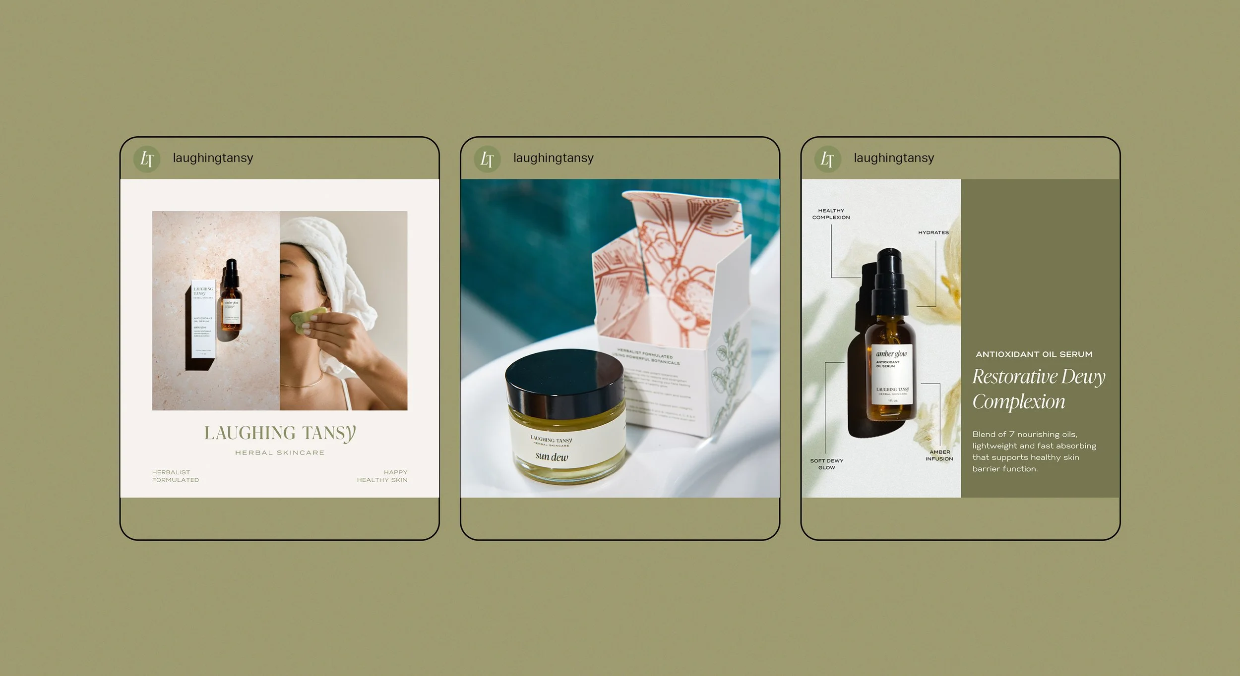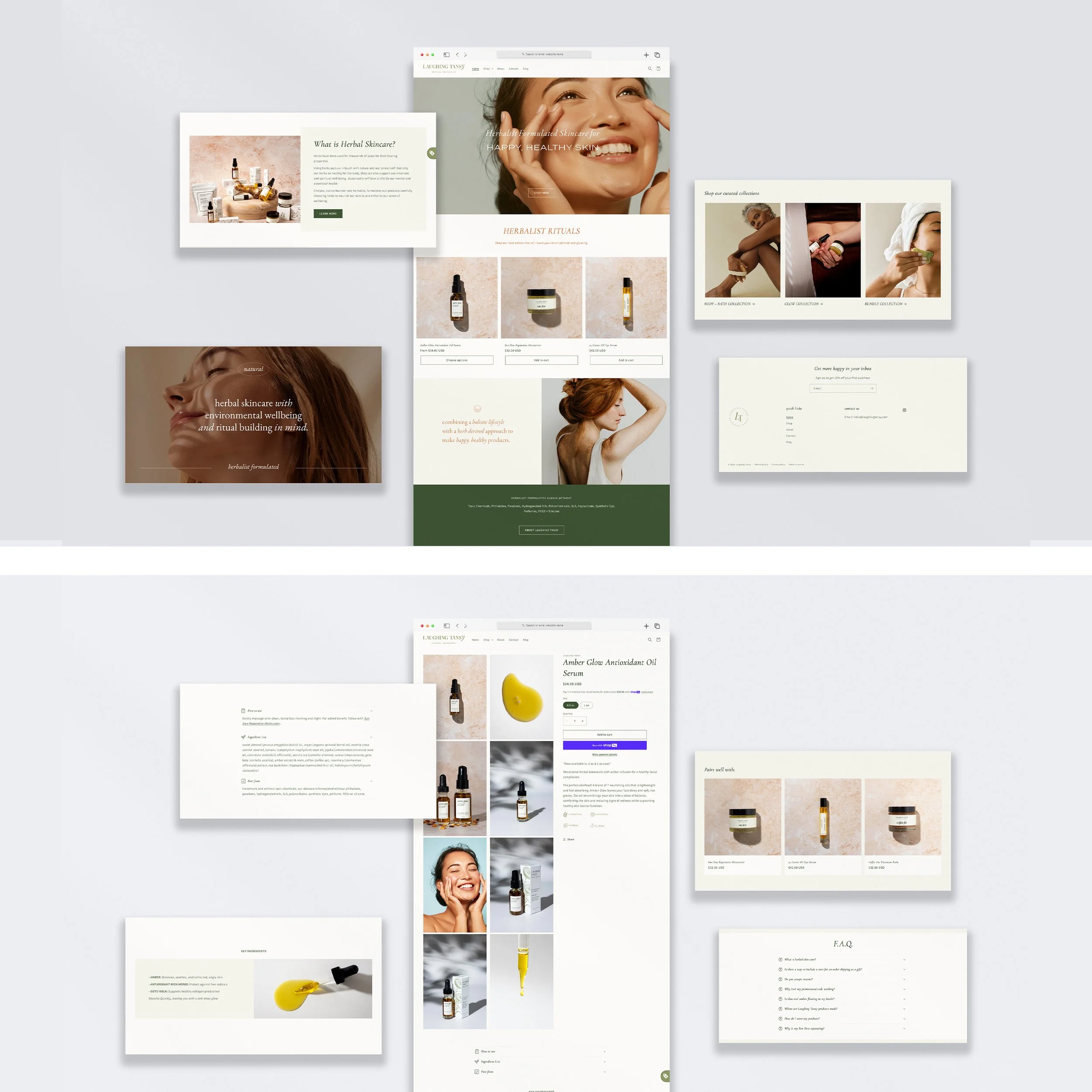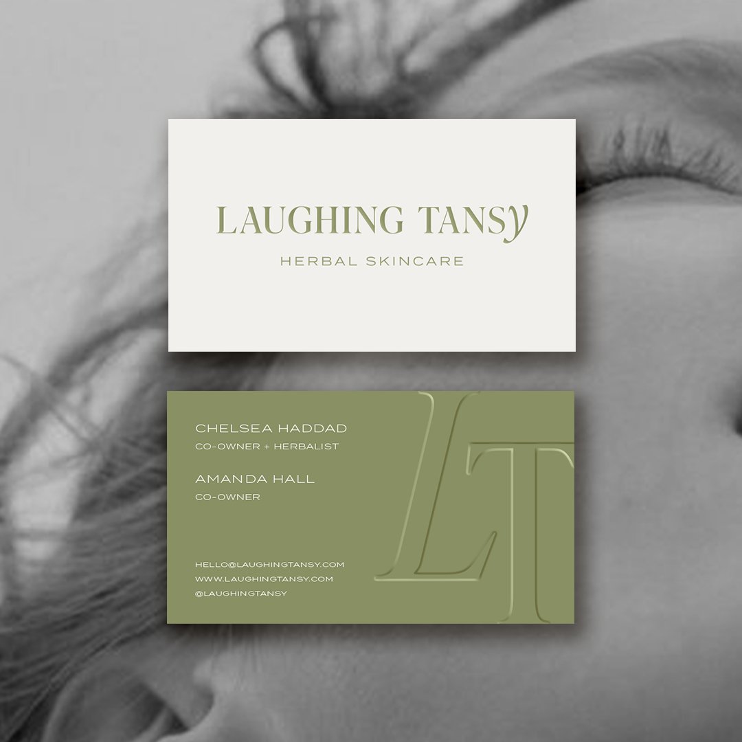 We brought the brand ethos to life through their logo mark that reflected the luxuriously effective skincare with a serif font and created custom lettering in the ‘Y’ to reflect the softness and curves of the face. Our color palette was earthy to reflect the natural ingredients used in all of their products and colors that would evoke serenity and ease. Working these elements into their packaging we added illustrations of the main ingredient found in the product as a way to bring awareness to the herbalist formulated skincare. There is a bit of lightness and fun that is in the Laughing Tansy personality while still possessing an air of sophistication that fits the premium quality products. We carried this same thought process and feelings into their product photography and website to create a full user experience that allows the customer to really nourish themselves in the Laughing Tansy ethos and community.
