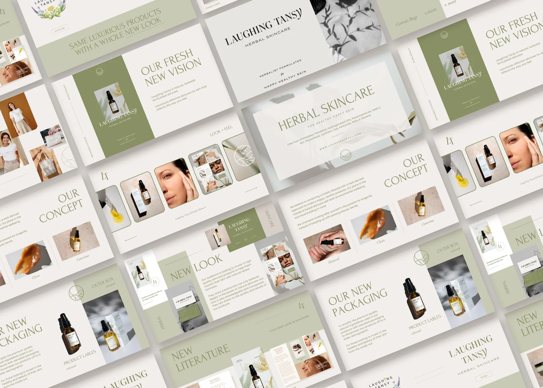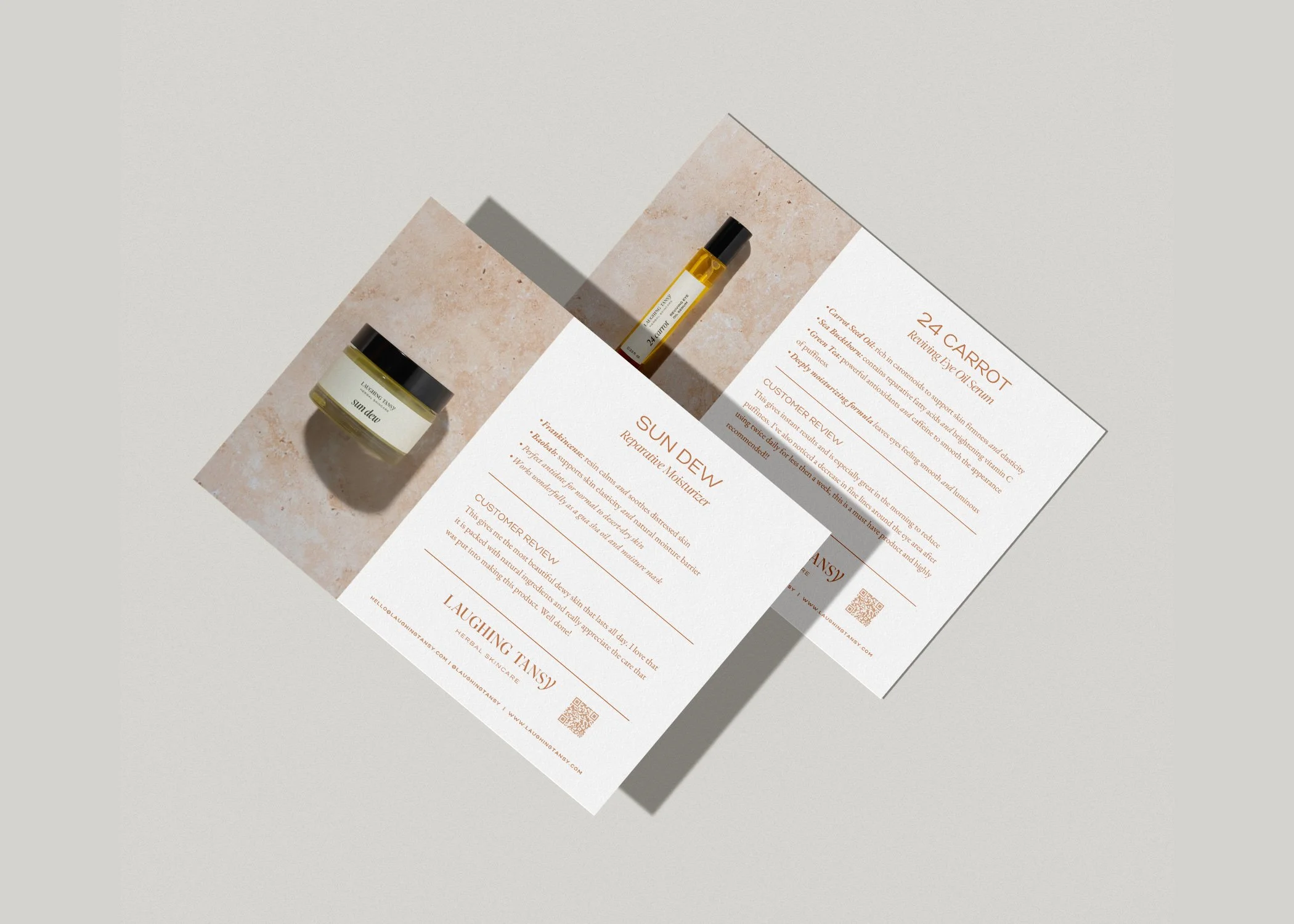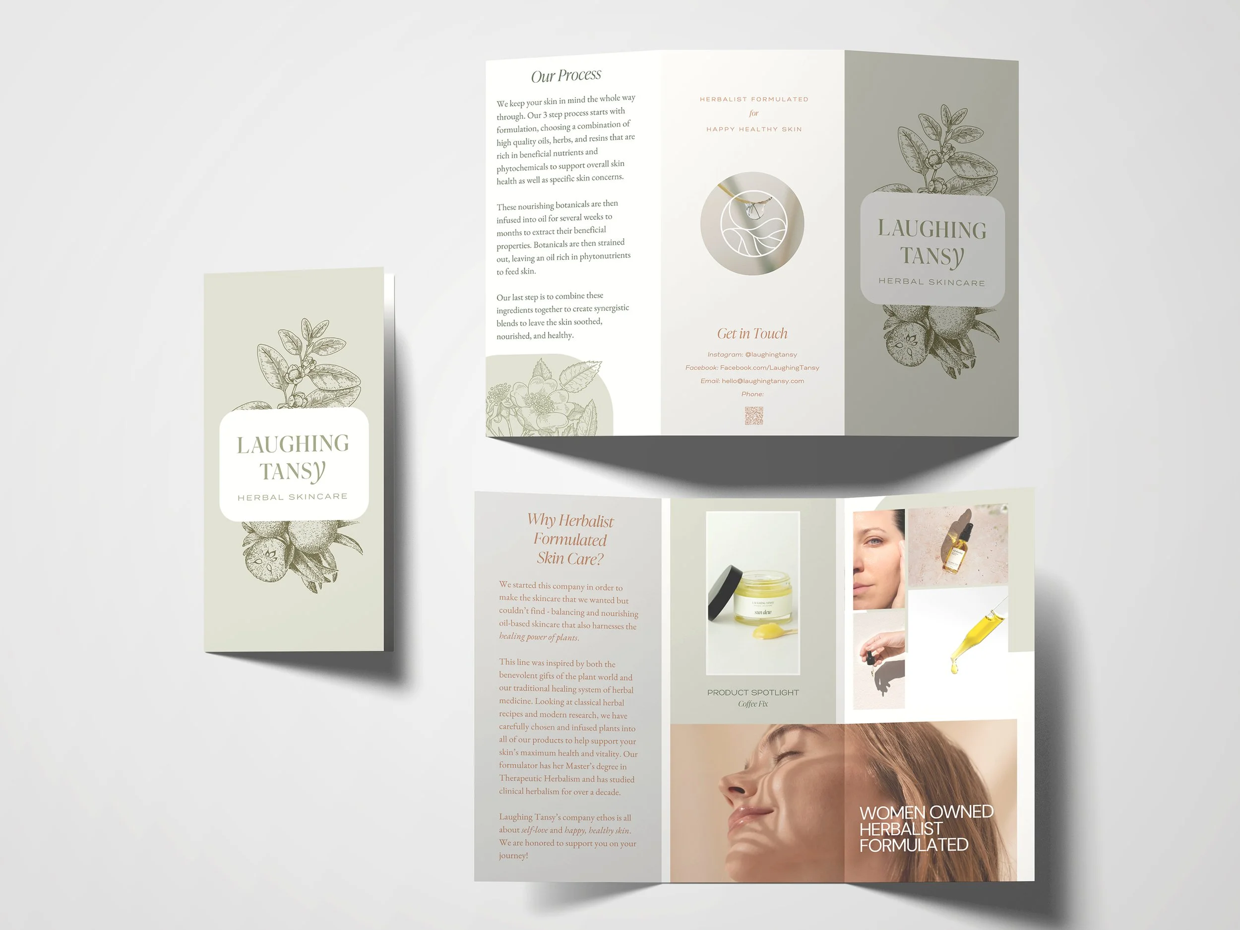 We brought the brand ethos to life through their logo mark that reflected the luxuriously effective skincare with a serif font and created custom lettering in the ‘Y’ to reflect the softness and curves of the face. Our color palette was earthy to reflect the natural ingredients used in all of their products and colors that would evoke serenity and ease. Working these elements into their packaging we added illustrations of the main ingredient found in the product as a way to bring awareness to the herbalist formulated skincare. There is a bit of lightness and fun that is in the Laughing Tansy personality while still possessing an air of sophistication that fits the premium quality products. We carried this same thought process and feelings into their product photography and website to create a full user experience that allows the customer to really nourish themselves in the Laughing Tansy ethos and community.